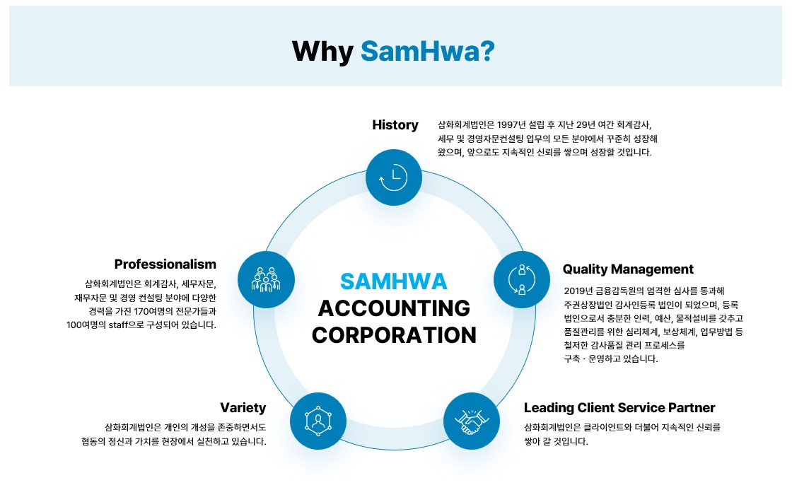 삼화회계법인이 추구하는 서비스는 단순한 용역 제공이 아닌 경영의 동반자로서 고객의 실질적인 성장에 도움이 되고자 합니다.